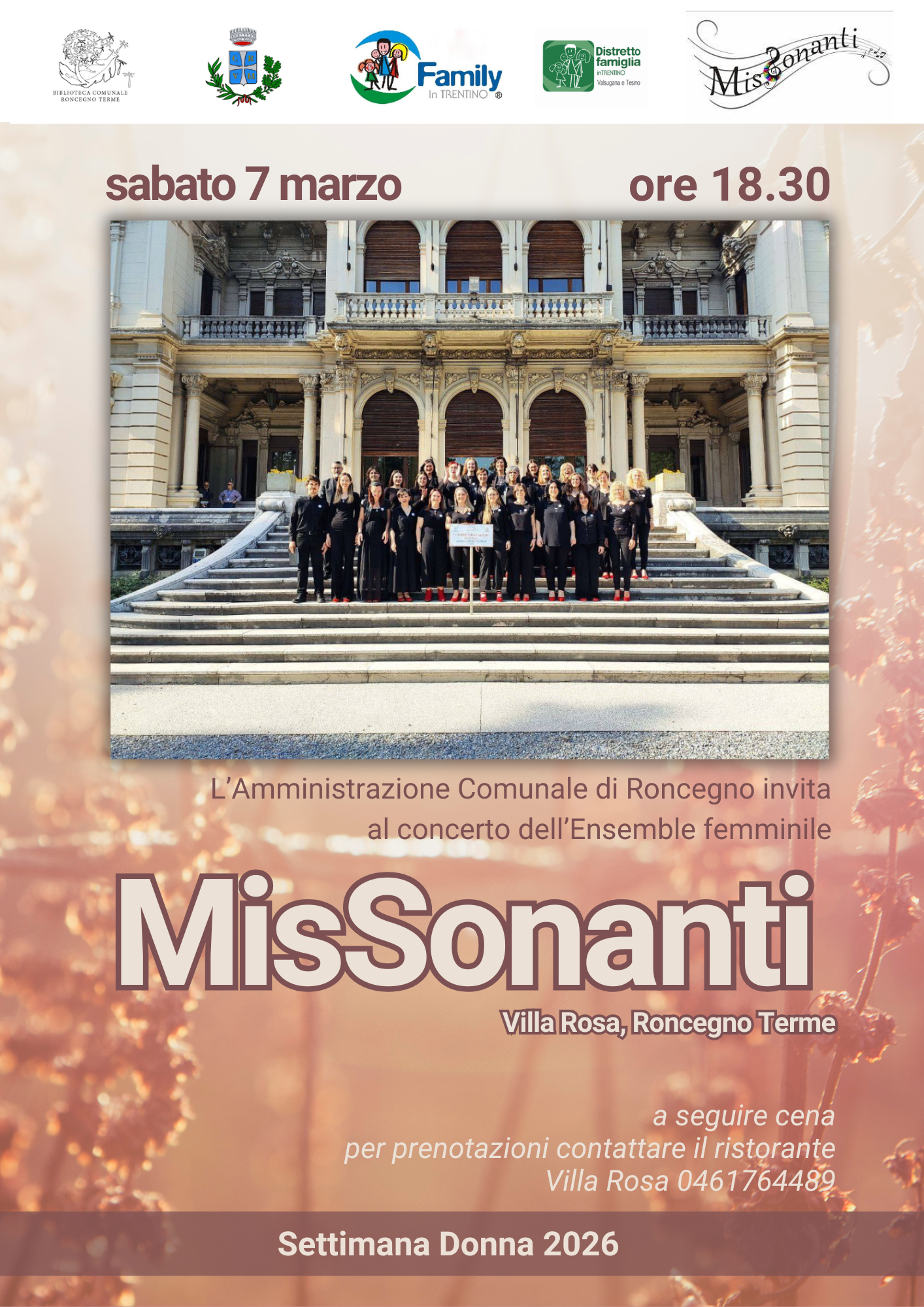 Cos'è L'Amministrazione comunale invita al concerto dell'Ensemble femminile MisSonanti.A seguire cena al Ristorante Villa Rosa su prenotazione