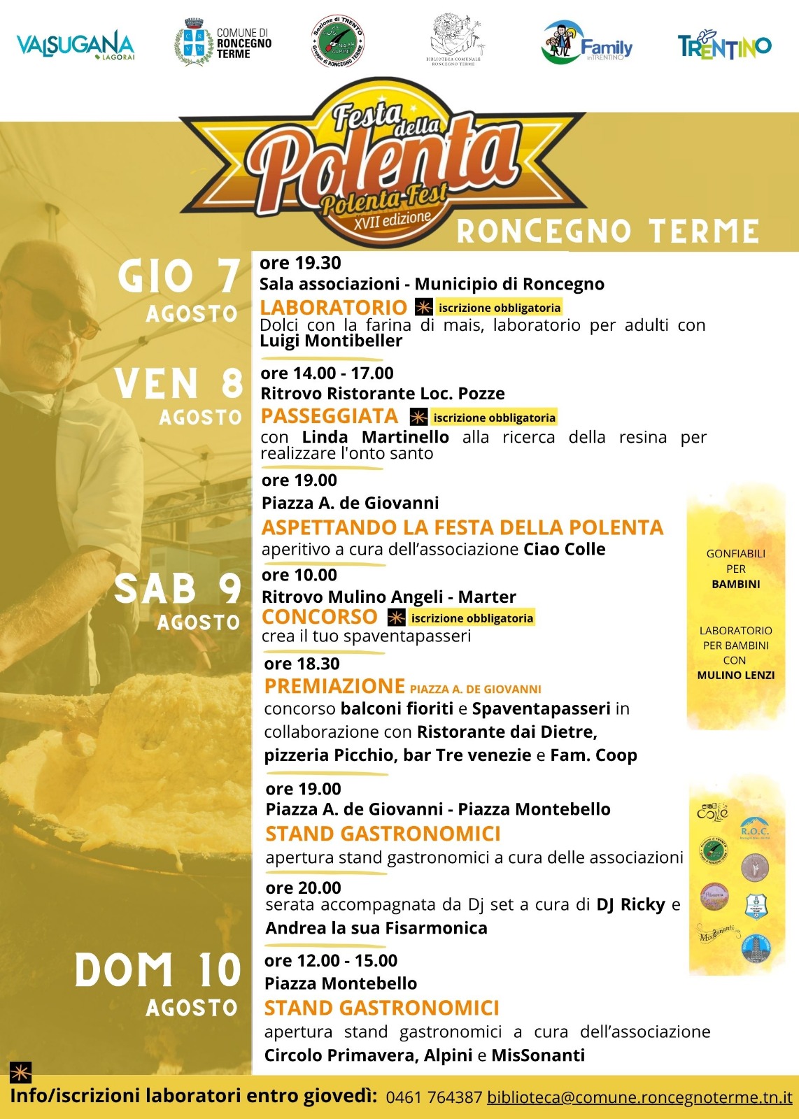 - giovedì 7 agosto - ore 19.30 sala riunioni del Municipio → laboratorio per adulti: dolci di farina di mais con Luigi Montibeller (iscrizione obbligatoria in biblioteca).