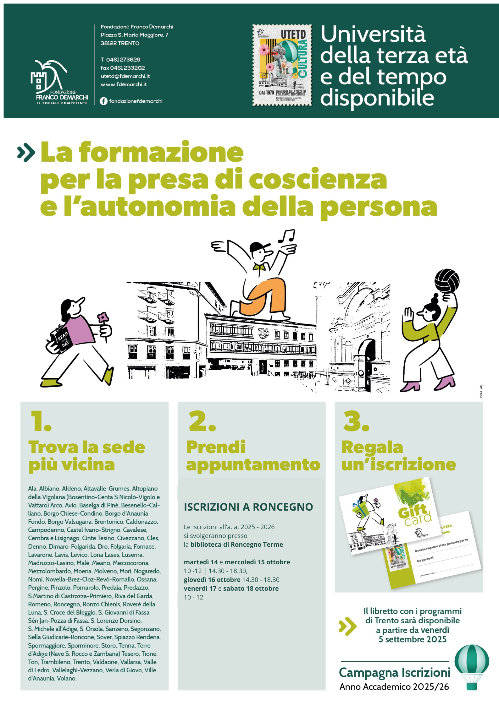 Per iscriversi all'Università della Terza Età e del Tempo Disponibile per l'anno accademico 2025-2026 è necessario effettuare il versamento di € 20 e completare l'iscrizione in Biblioteca nelle seguenti giornate e orari