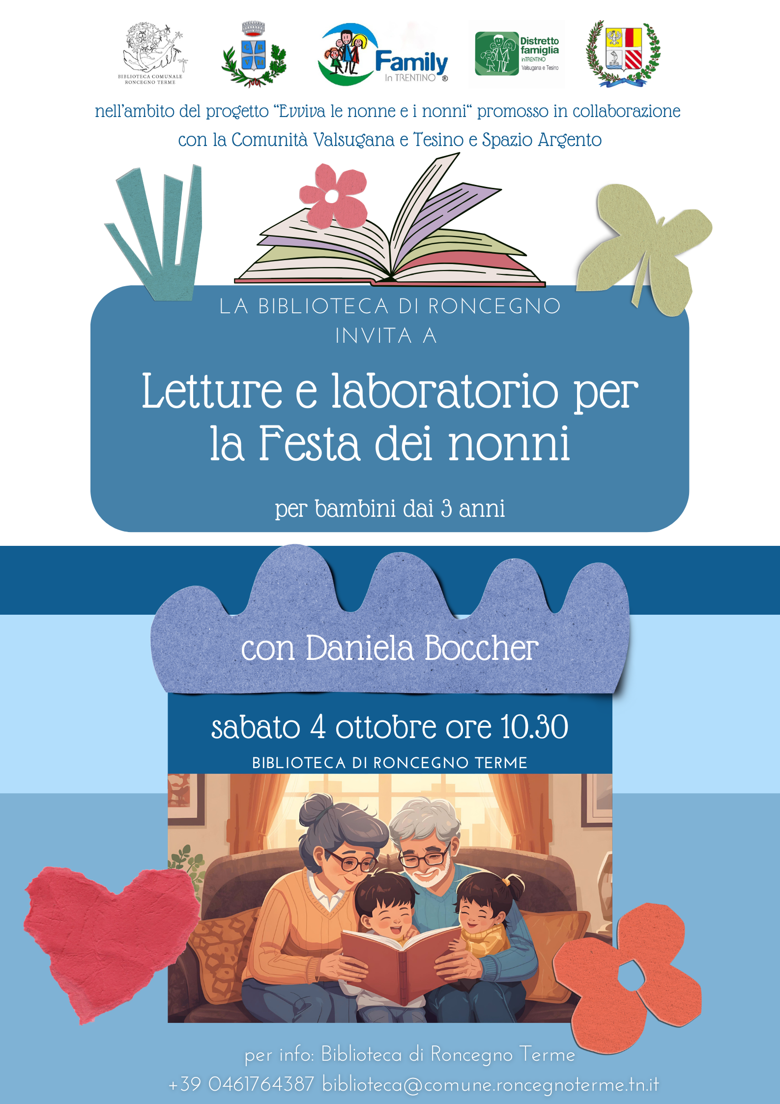 Nell'ambito del progetto "Evviva le nonne e i nonni" promosso in collaborazione con la Comunità Valsugana e Tesino e Spazio Argento la Biblioteca di Roncegno invita alle letture e laboratorio per la Festa dei nonni con Daniela Boccher.
