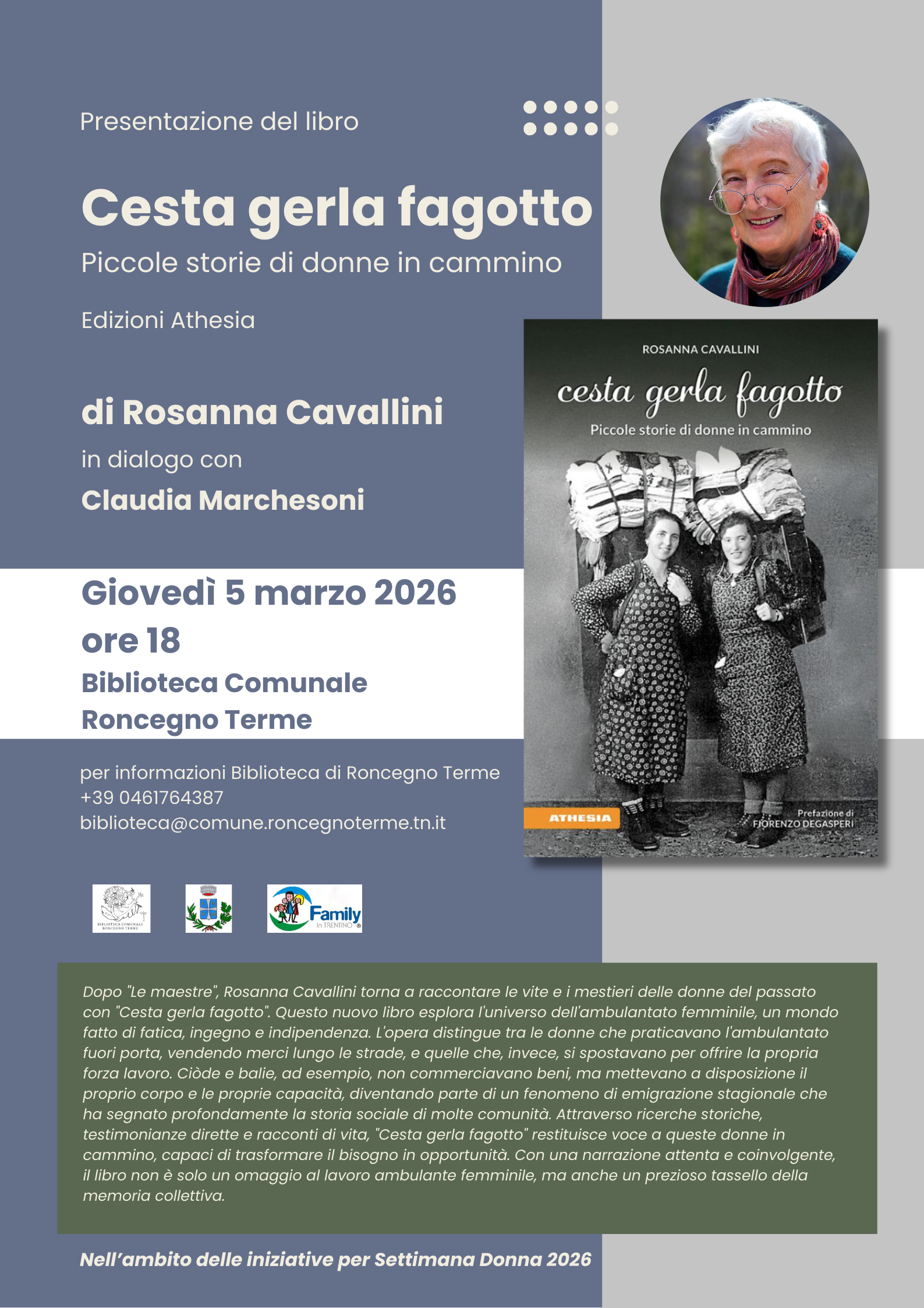 Presentazione del libro "Cesta gerla fagotto. Piccole storie di donne in cammino" di Rosanna Cavallini in dialogo con Claudia Marchesoni.